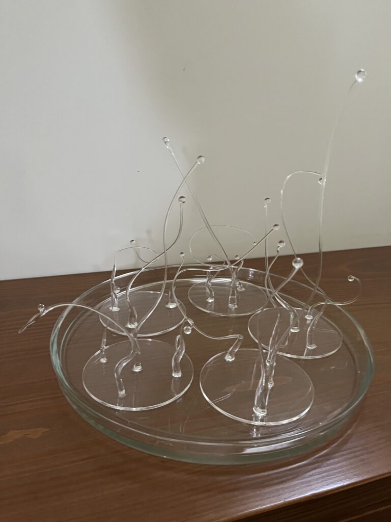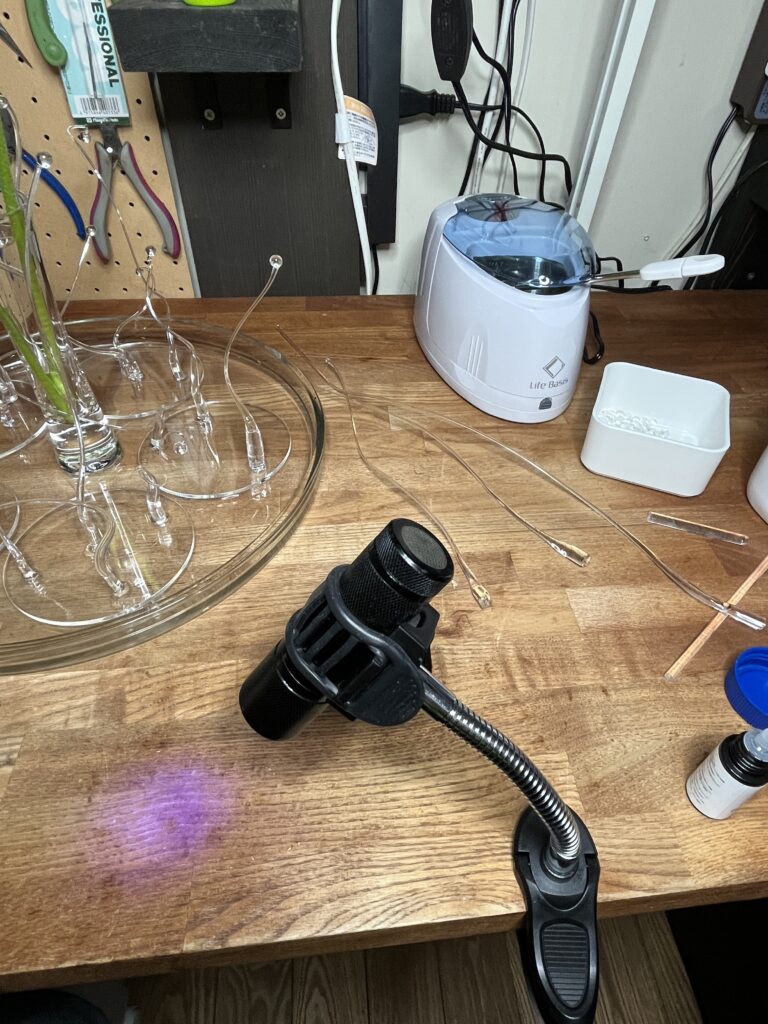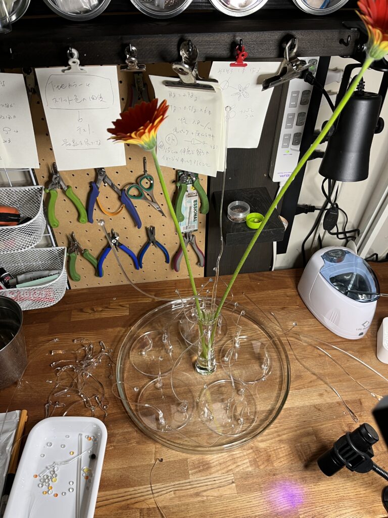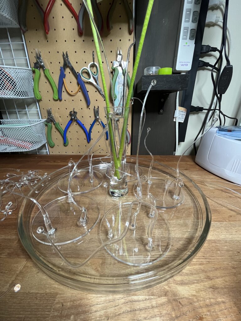 アクリル板にガラスで作った枝物を接着します。接着剤はネイルアートで使われるレジンです。紫外線ですぐに固着するので便利です。
