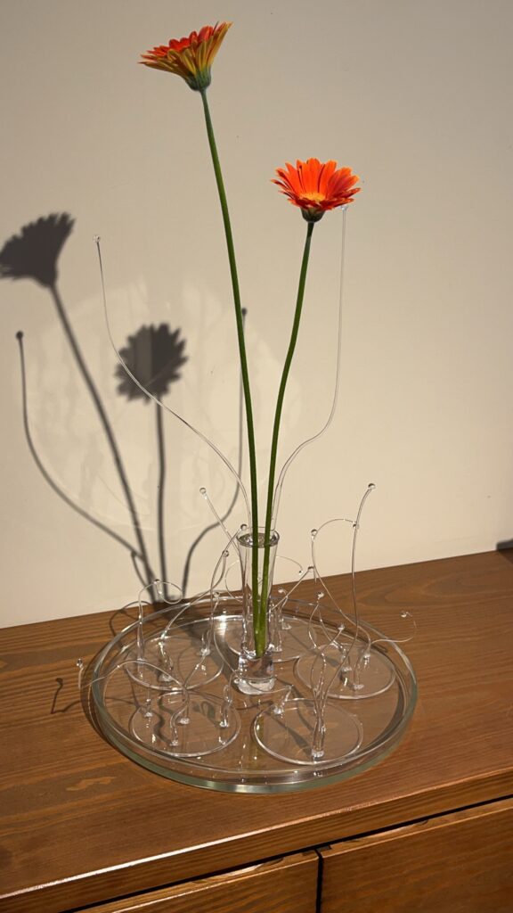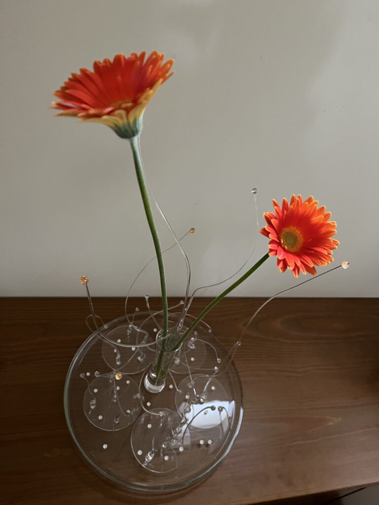 展示会となると、皆さん「 花 」「 花 」「 花 」のオンパレードになってしまいがちなのですが、私は引き算で考えてみることにします。究極は一輪ですが、どうやら2輪でバランスがとれそうです。
