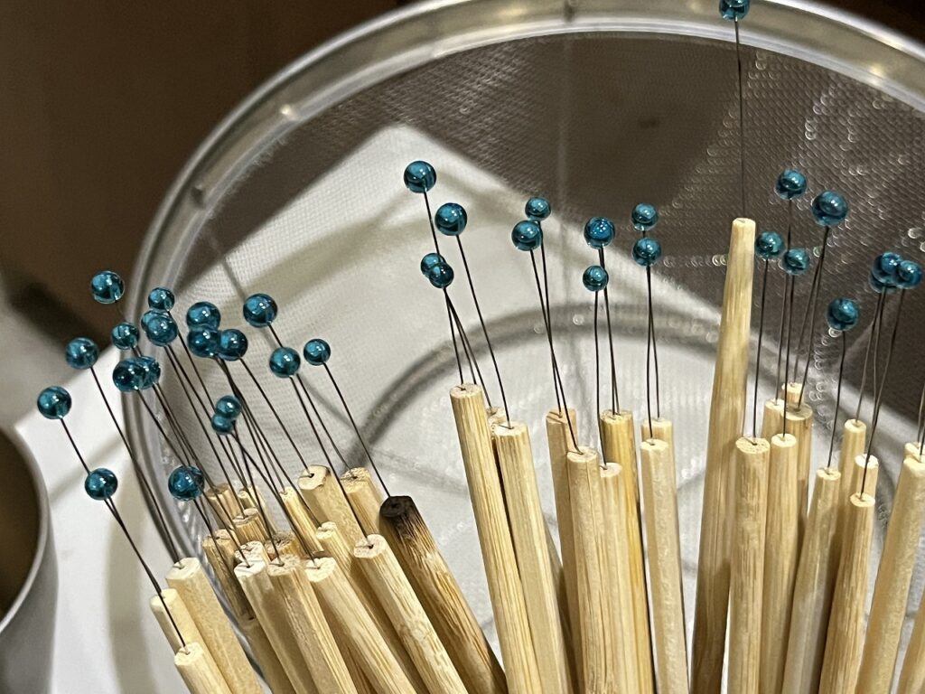 割りばしにワイヤーを差し込んで固定し、その先端にガラスをバーナーで溶かしながら丸く成型していきます。